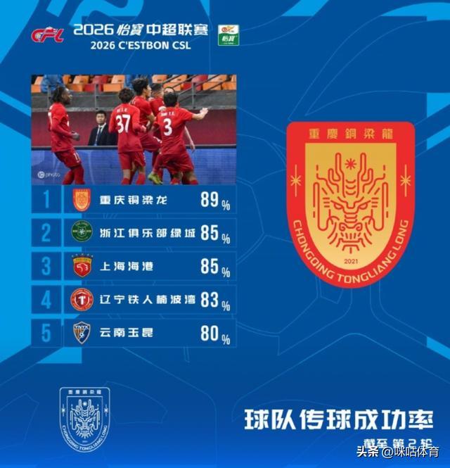中超联赛官方公布了联赛第2轮球队传球告捷率排名榜,重庆铜梁龙以89%的传球告捷率居首。